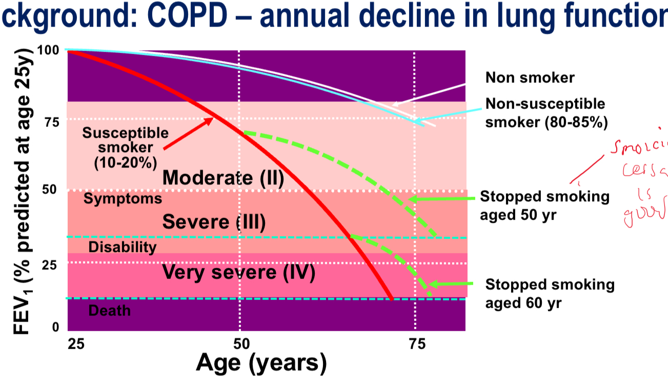 Describe the effects of smoking on a COPD patient and link it to their lung fucntion (FEV1)