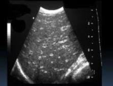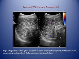 Punctate echogenic foci in liver +/- spleen