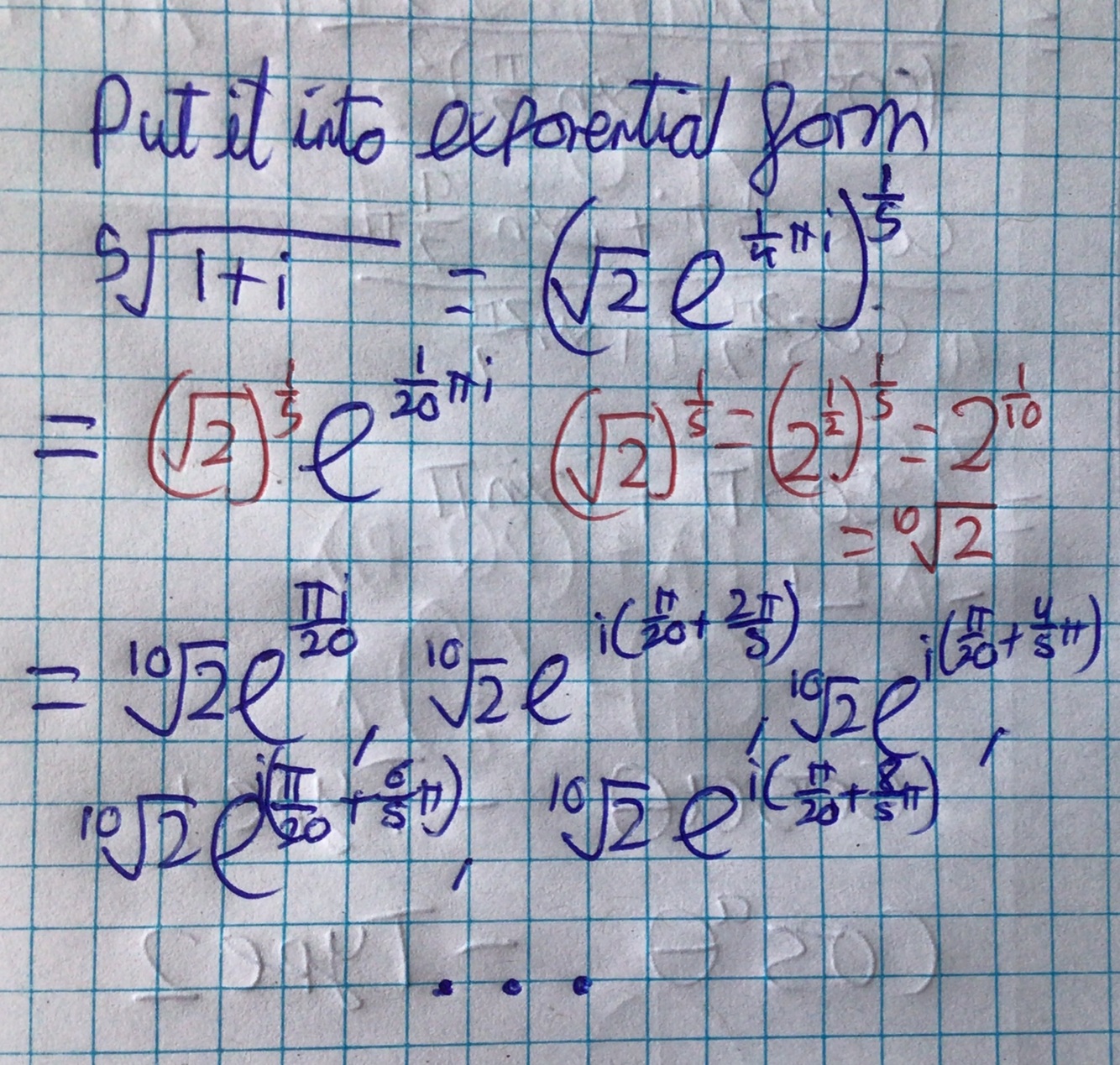 The first answer will be 1 then they will be spaced out 2π/5 around the argand diagram