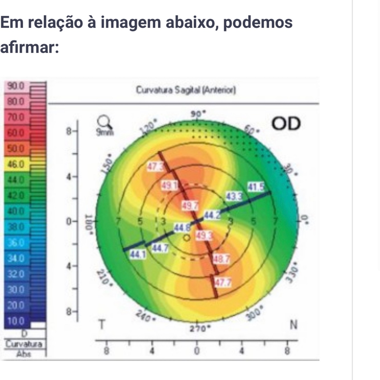 A imagem mostra um exame de topografia corneana, no qual evidenciamos um astigmatismo regular (por seu meridiano curvo ser ortogonal ao plano), simétrico (um lado semelhante ao outro) e ligeiramente oblíquo (orientação do eixo curvo levemente inclinado para temporal). Neste exame as cores mais quentes representam uma curvatura maior, indicando que o meridiano mais curvo está a 120 graus.