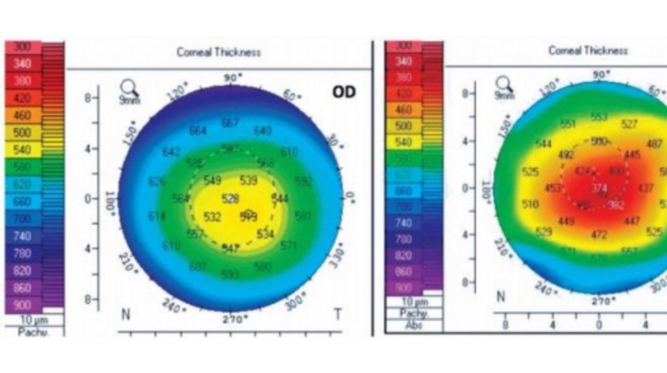 Além disso, a marca do Ceratocone é a região do afinamento ser coincidente com a ectasia, igual mostrado na figura. A degeneração marginal pelúcida é caracterizada pelo afinamento periférico inferior, com ectasia da córnea sobrejacente superior