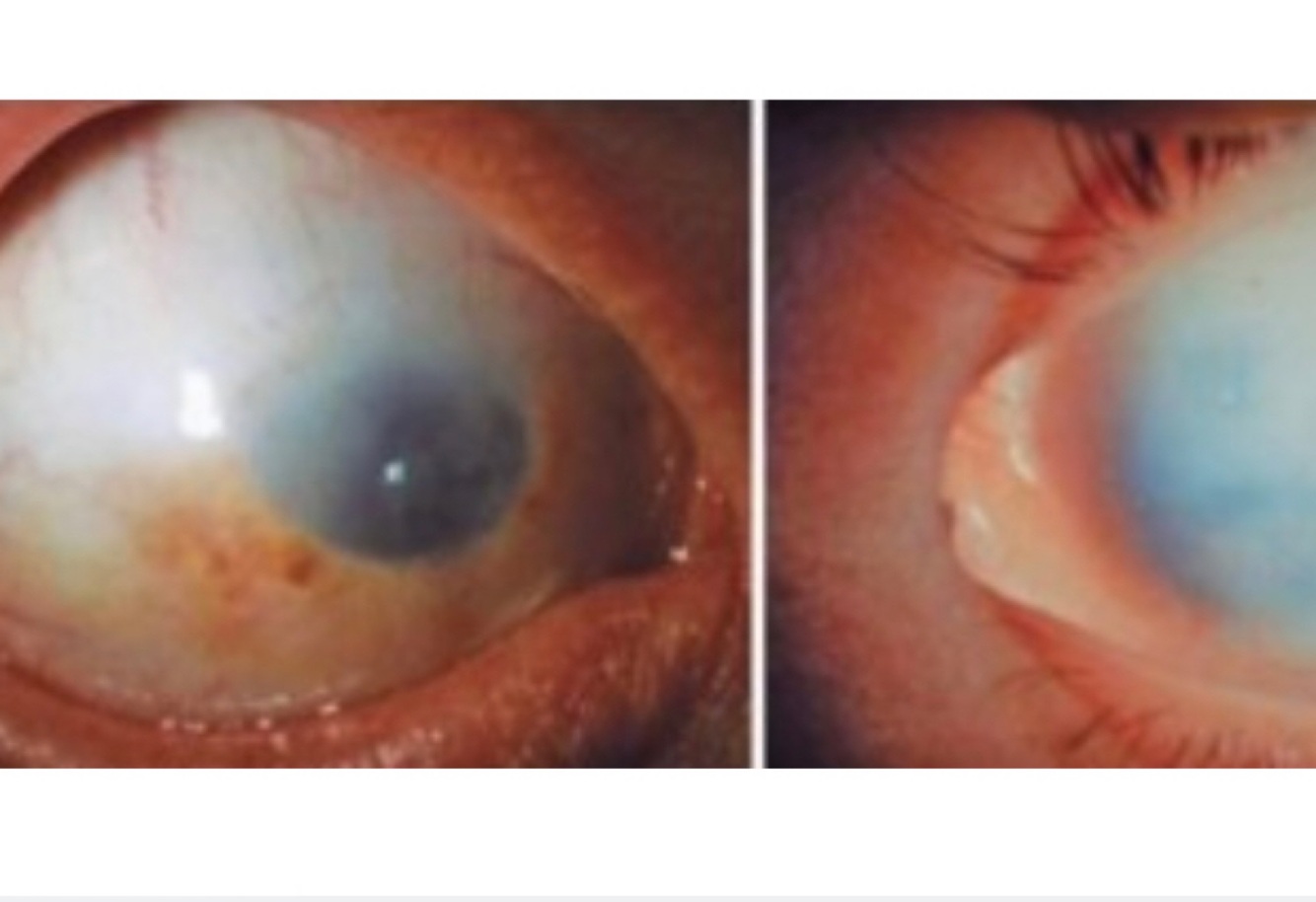 A figura mostra uma alteração corneana típica de esclerocórnea devido ao desarranjo da disposição das fibras de colágeno na córnea contribuindo para um aspecto mais semelhante ao da esclera. A esclerocórnea é uma condição não progressiva, bilateral e assimétrica
