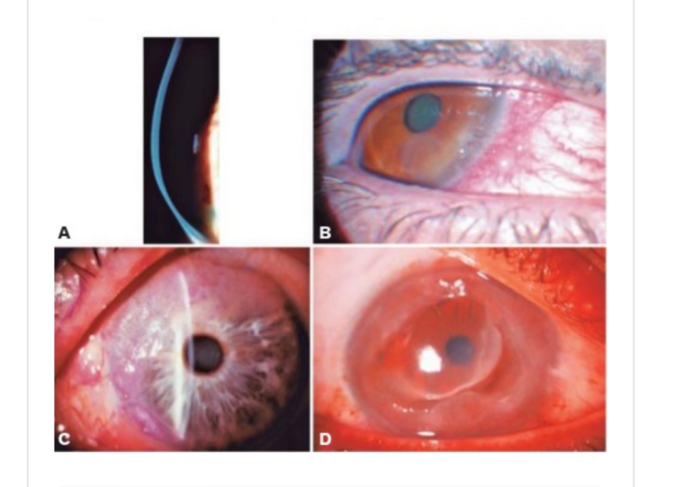 A figura D evidencia um afinamento corneano periférico, formando “córnea em lente de contato” que ocorre na Úlcera de Mooren ou Ceratite Ulcerativa Periférica (abreviada do inglês como PUK