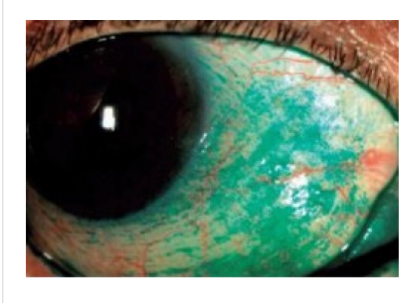 A figura mostra uma coloração de Lissamina Verde que é um corante semelhante ao Rosa Bengala, também corando as células desvitalizadas da conjuntiva, e é portanto utilizado para avaliação do olho seco, com a vantagem de menor desconforto em relação ao rosa bengala.