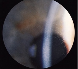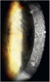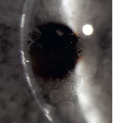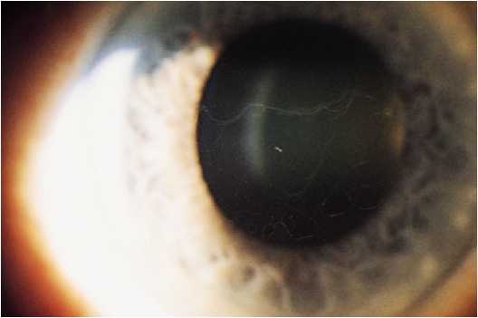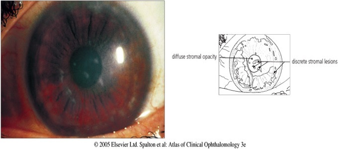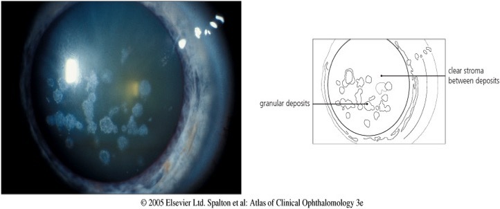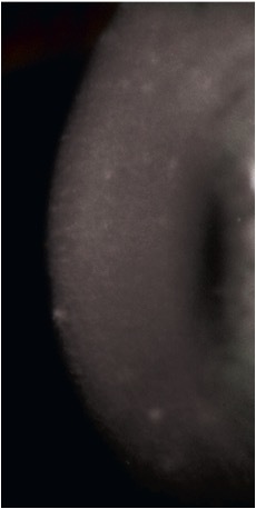 diffuse, “ground-glass” haze lesions, corneal haze between lesions, gray/white or milky/white opacities throughout stroma and limbus to limbus