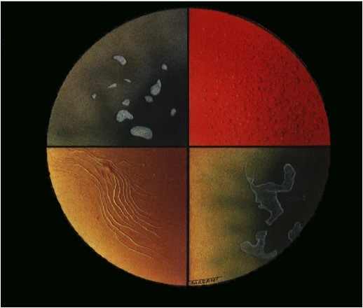 dots, microcysts, fingerprints (least common) and maps (most common)