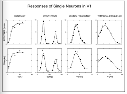 Tuning characteristics of cortical neurons measured with sine wave grating stimuli. This is the quantitative version of experiments performed by Hubel and Wiesel. Notice that each neuron is tuned along multiple dimensions and the variability of a neuron’s response increases with its response rate. What are the consequences of these receptive field properties?