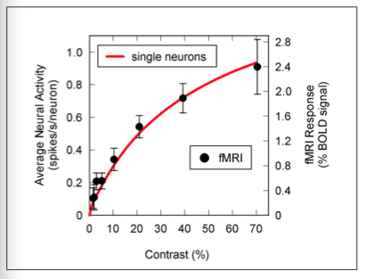 Relationship between contrast response function measured with an fMRI in humans and the average contrast response function of single neurons measured in primary visual cortex of the macaque monkey.