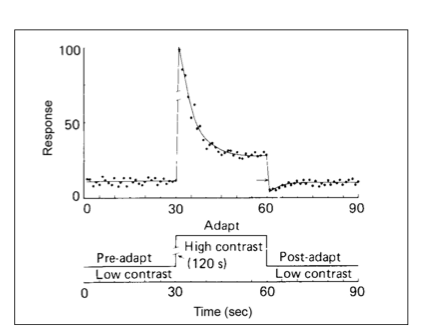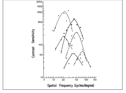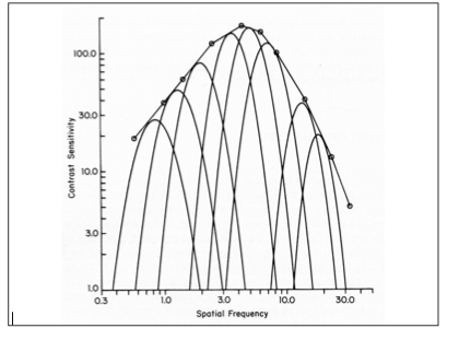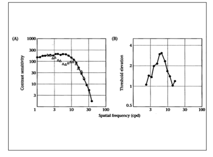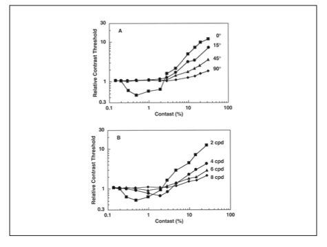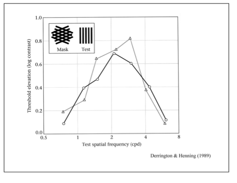 The behavioral contrast sensitivity function probably reflects the combined neural contrast sensitivity of many cortical neurons, each tuned to a particular range of frequencies. Similarly (but not shown), behavioral contrast sensitivity as a function of orientation reflects the combined neural contrast sensitivity of many cortical neuros each tuned to a particular range of orientations. This “multiple channels” hypothesis is plausible if the neurophysiology description of primary visual cortex is accurate, but is there any independent behavioral evidence for this hypothesis?