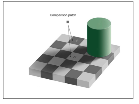 The gray scale (luminance) is the same for the two squares in the checerboard; in fact, it is exactly the same gray shown at the tails of the arrows. Illustrates how perception may reflect the complex properties of the environment. Figure by Edward Adelson.