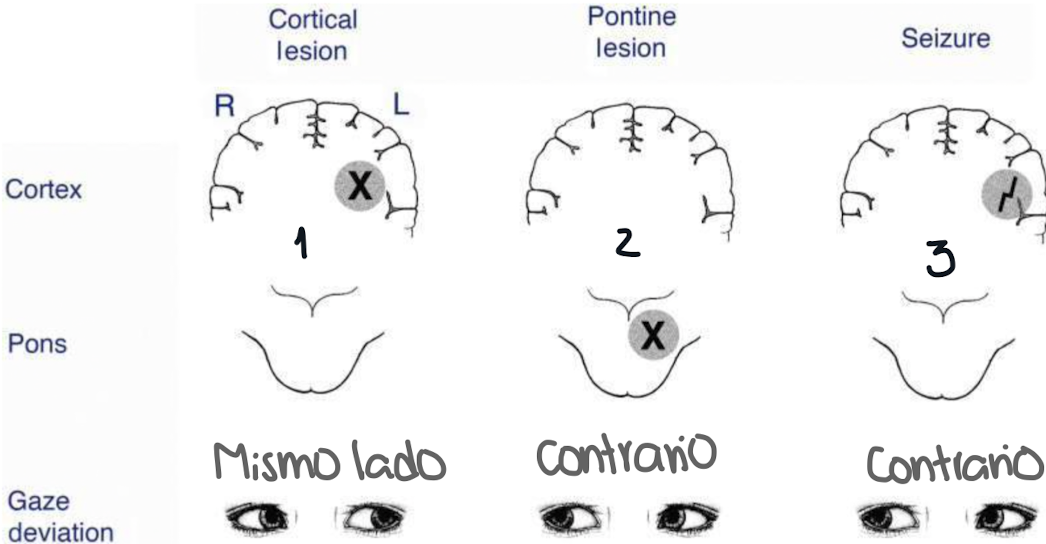 Lesión cortical: Los ojos se desvían del mismo lado de la lesión.