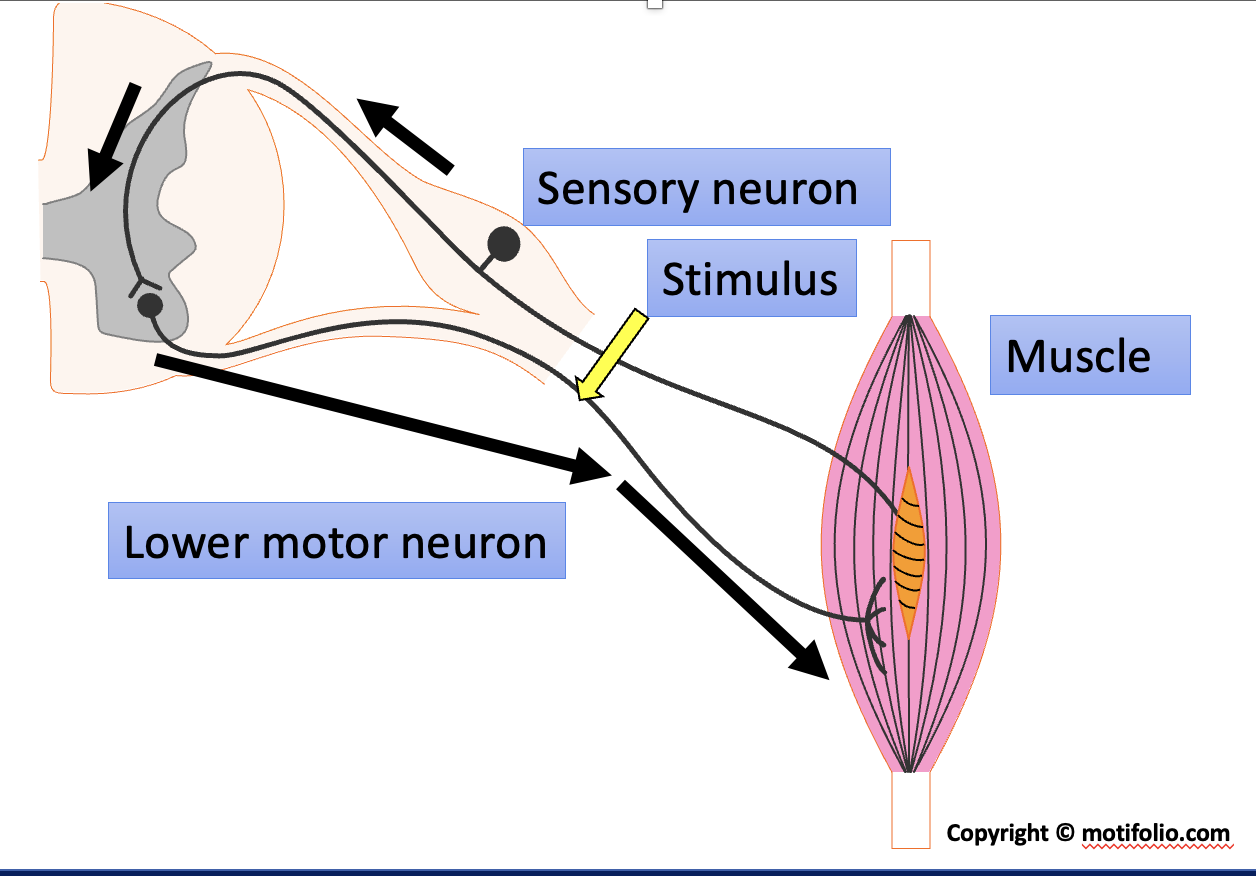 The action potentials can travel along the sensory nerve to the spinal cord. These can then cause the lower motor neurons in the spinal cord to become activated. Action potentials in the motor axons can travel along the motor neuron to the muscle where they cause muscle contraction, a twitch. This is a reflex activation of the muscle.