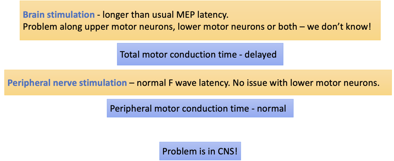The activation of the upper motor neurons causes action potentials to travel along the entire motor pathway (upper and lower motor neurons) to cause muscle contraction. This EMG response is known as a motor evoked potential (MEP).