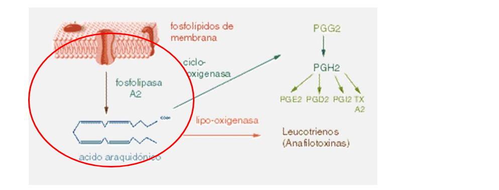 inhibe la acción de la enzima fosfolipasa, impidiendo la liberación del ácido araquidónico de la membrana y consecuentemente su conversión a prostaglandina (mediante la ciclooxigenasa) y leucotrienos (mediante la lipooxigenasa).