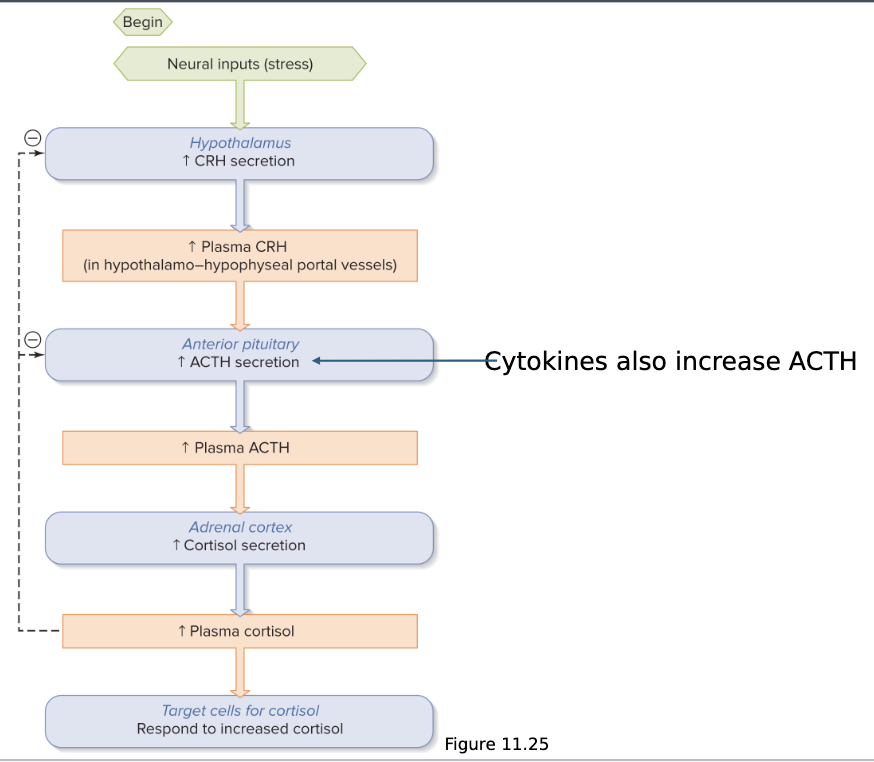 Release of cortisol by stimulation from cytokines works as a negative feedback mechanism to prevent excess inflammation and the damage caused by it