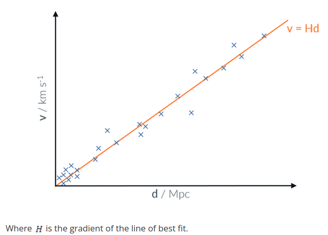The Big Bang theory suggests that the universe is expanding since galaxies are moving away relative to the Earth. This results in a redshift of distant galaxies moving away from the Earth. From this, a relationship between the recessional velocity of galaxies and the distance away from Earth was made - Hubble’s Law. The proportionaly constant is defined as Hubbles Constant.