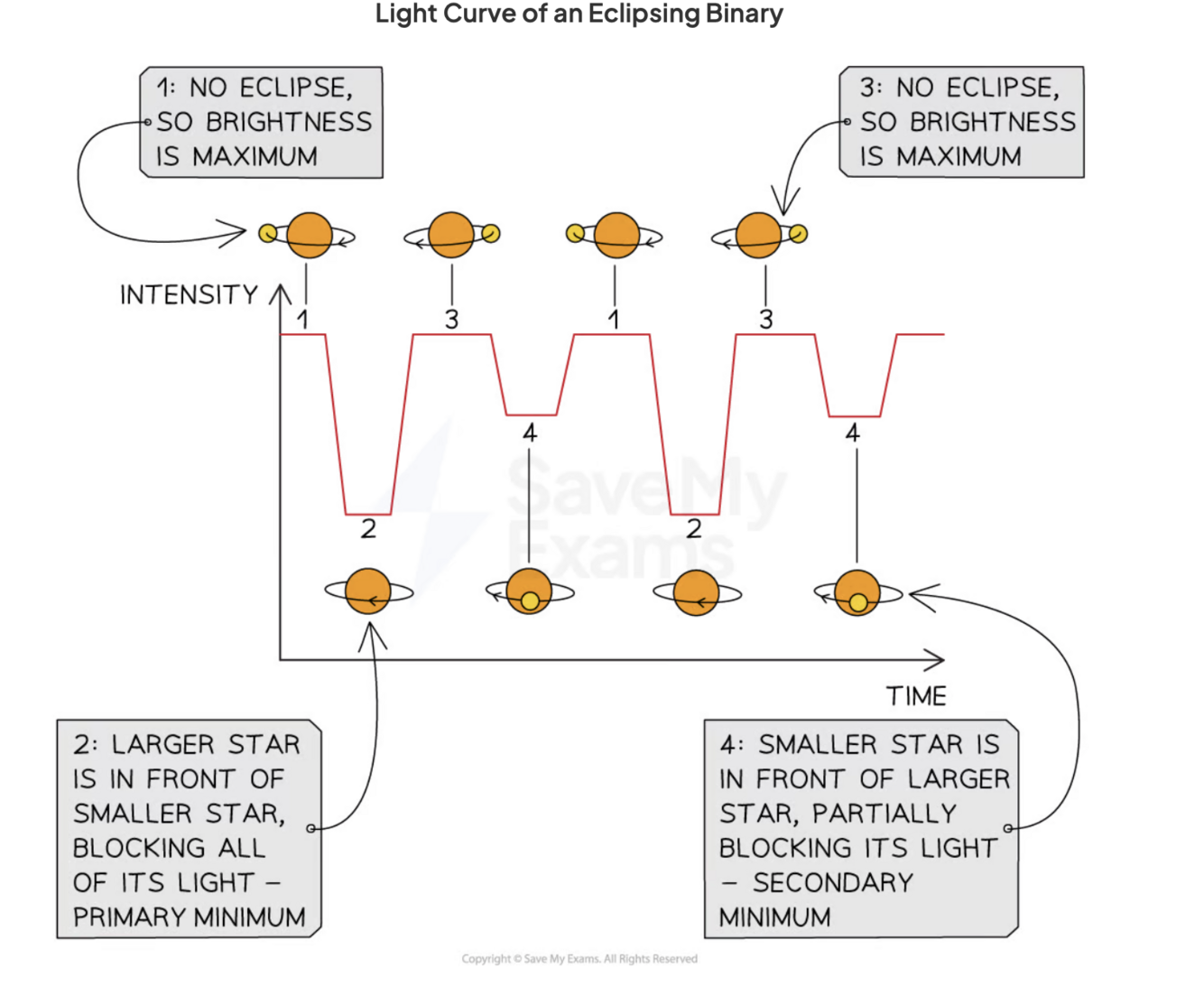 Describe the primary and secondary minima on a light intensity curve of an eclipsing binary AND what they are caused by