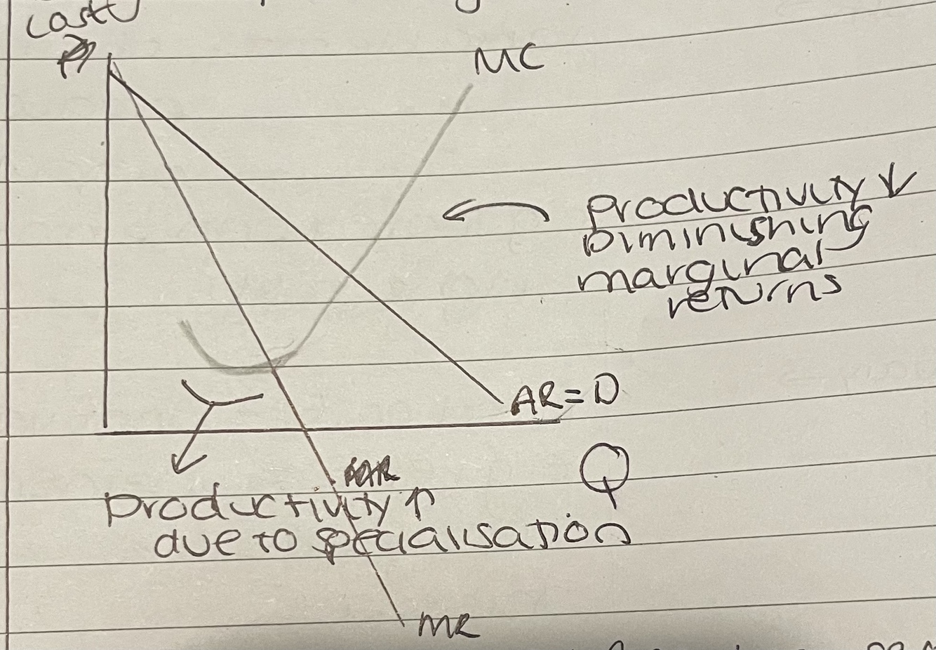 MC decreases at first due to productivity and specialisation