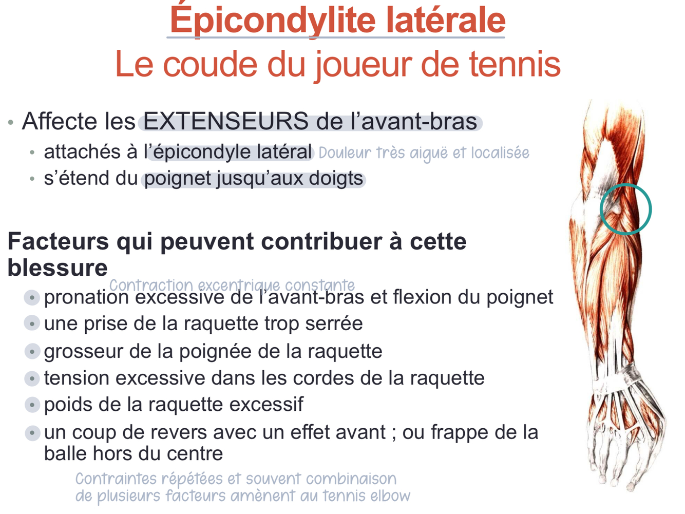 quel est l’autre nom pour l’épicondylite latérale, quelles structures affecte-t-elle et quels sont les facteurs contribuants?
