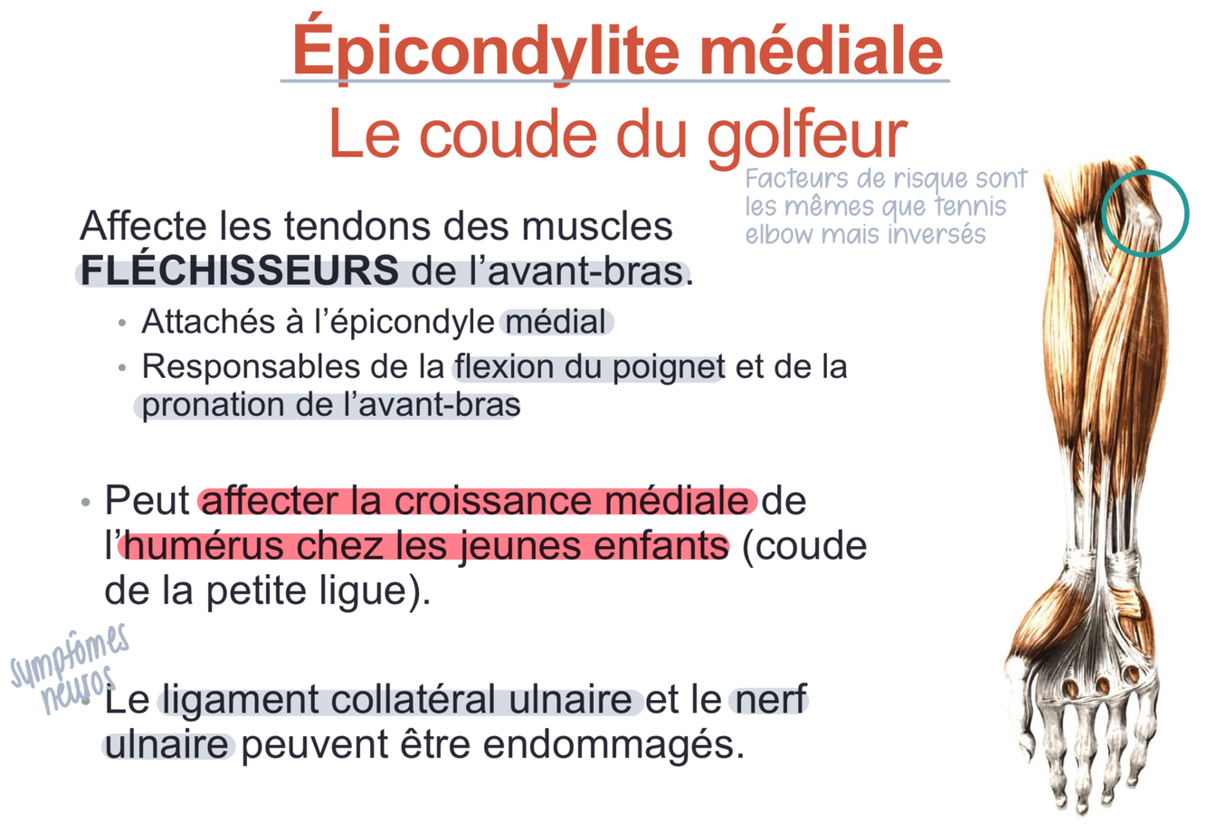 quel est l’autre nom pour l’épicondylite médiale, quelles structures affecte-t-elle et quels sont ses facteurs de risque?