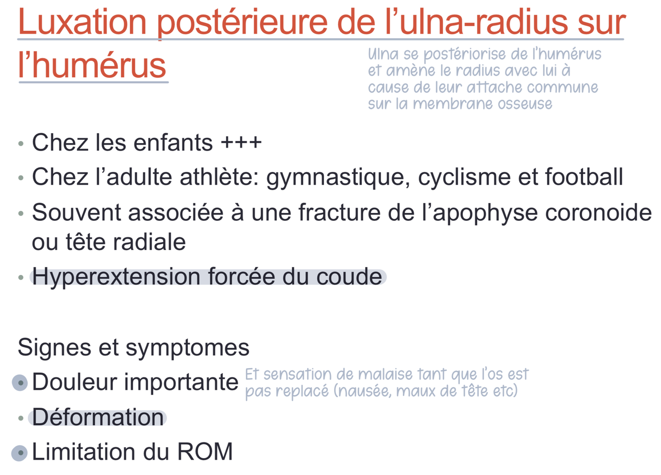 quel est le MDB de la luxation postérieure de l’ulna-radius sur l’humérus? que se passe-t-il et quels sont les SS?