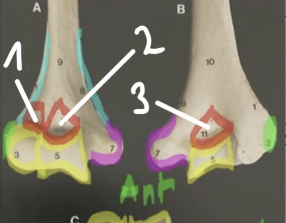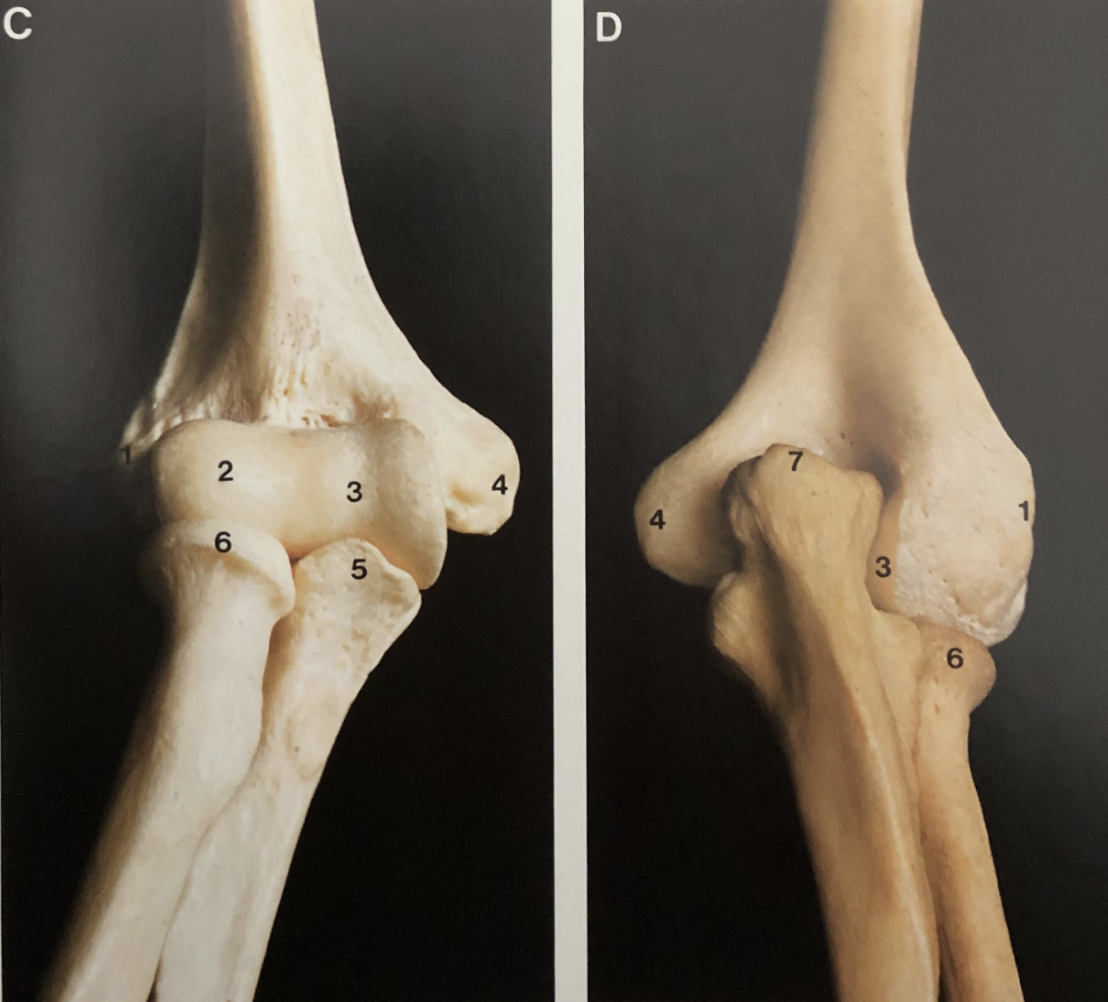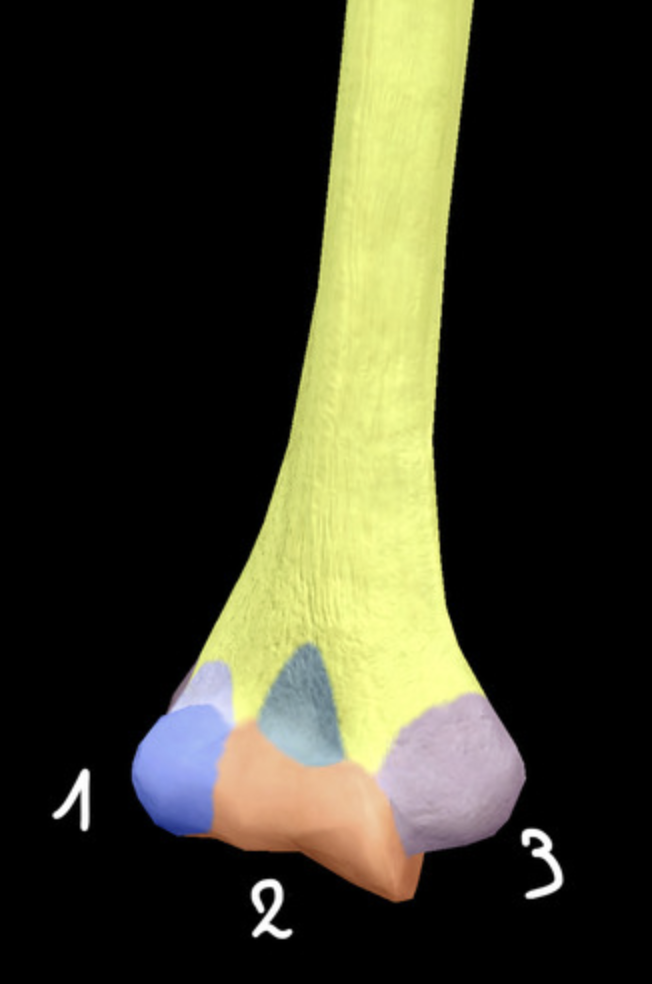 Comment s’appellent les 3 structures distinctes à l’extrémité distale de l’humérus? (En ventral)
