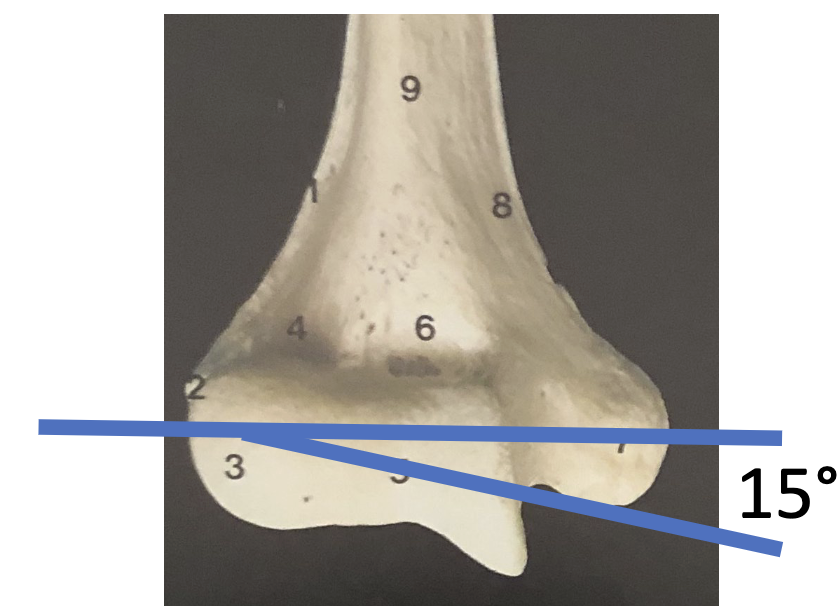 Inclinée de 15° à l’extérieur (lat) par rapport à l’axe de la diaphyse humérale