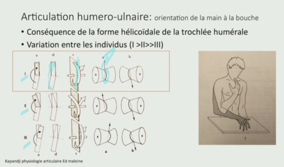 Il existe beaucoup de disparités quant à la flexion complète du coude, à cause des différences d’angle adoptés par la trochlée.