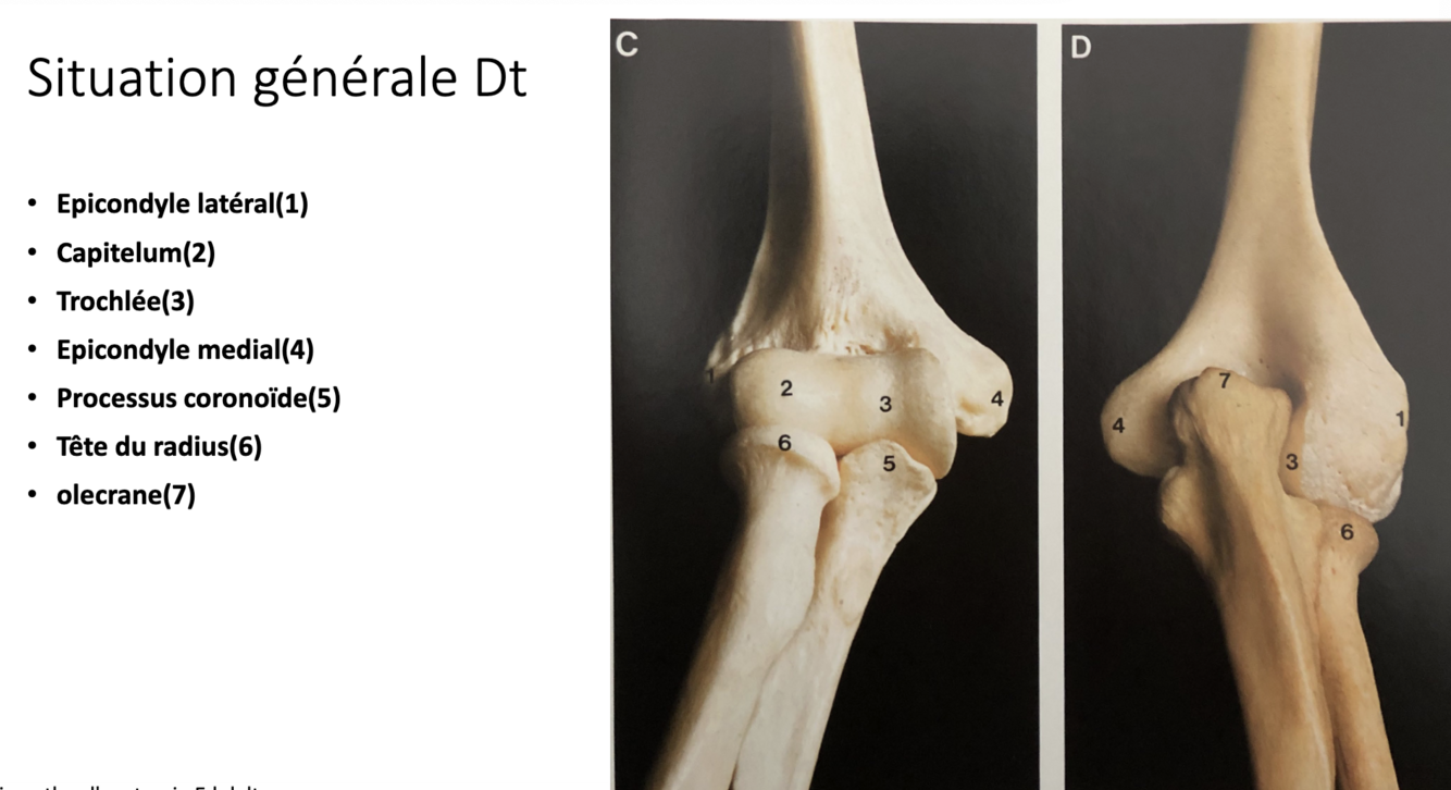 V/F: Il existe un épicondyle latéral (extrémité latérale du capitulum) et un épicondyle médial
