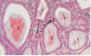 Coupe histologique de la thyroide, qu’est-ce que 1, 2 et 3? Qu’est-ce qui y est fait/entreposé?