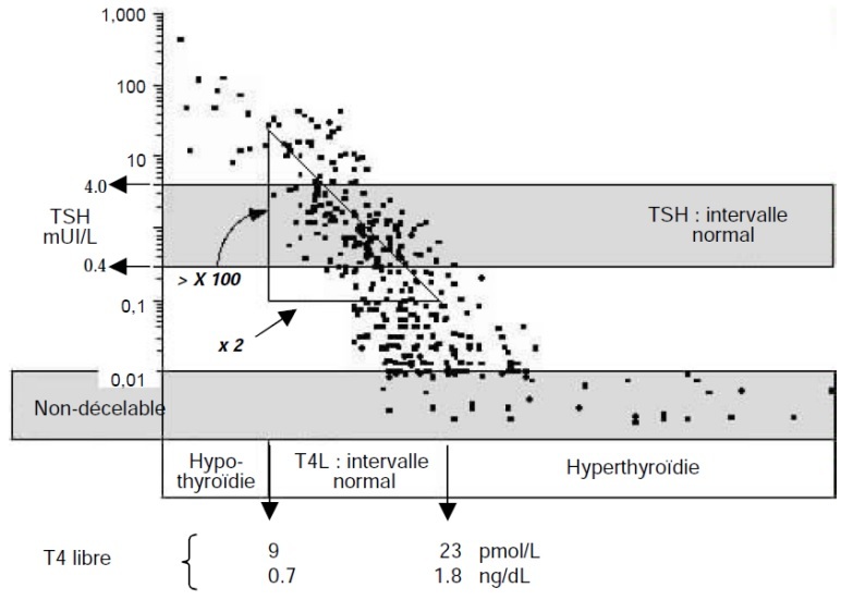 Relation log/linéaire inverse entre la TSH sérique et T4L. Tout excès/déficience de T4L sera détectée par l’hypophyse et entraînera une réponse amplifiée, exponentielle et inverse de la sécrétion de TSH.
