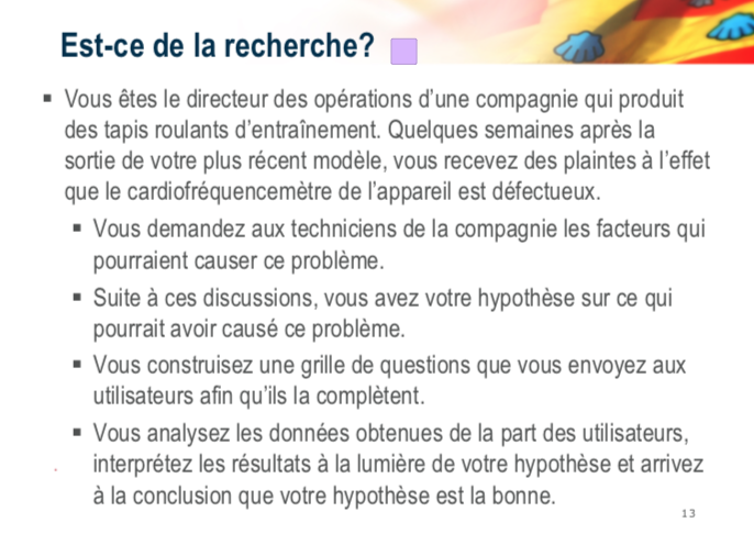 Est ce de la recherche? Vous avez participé à un atelier sur l’exercice chez les patients atteints de diabète de type I. Le sujet vous intéresse grandement. Après avoir effectué une revue de la littérature et questionné la personne ayant donné l’atelier, vous rédigez un rapport donnant des recommandations sur les modalités de l’exercice assurant un contrôle optimal de la glycémie chez ces patients.