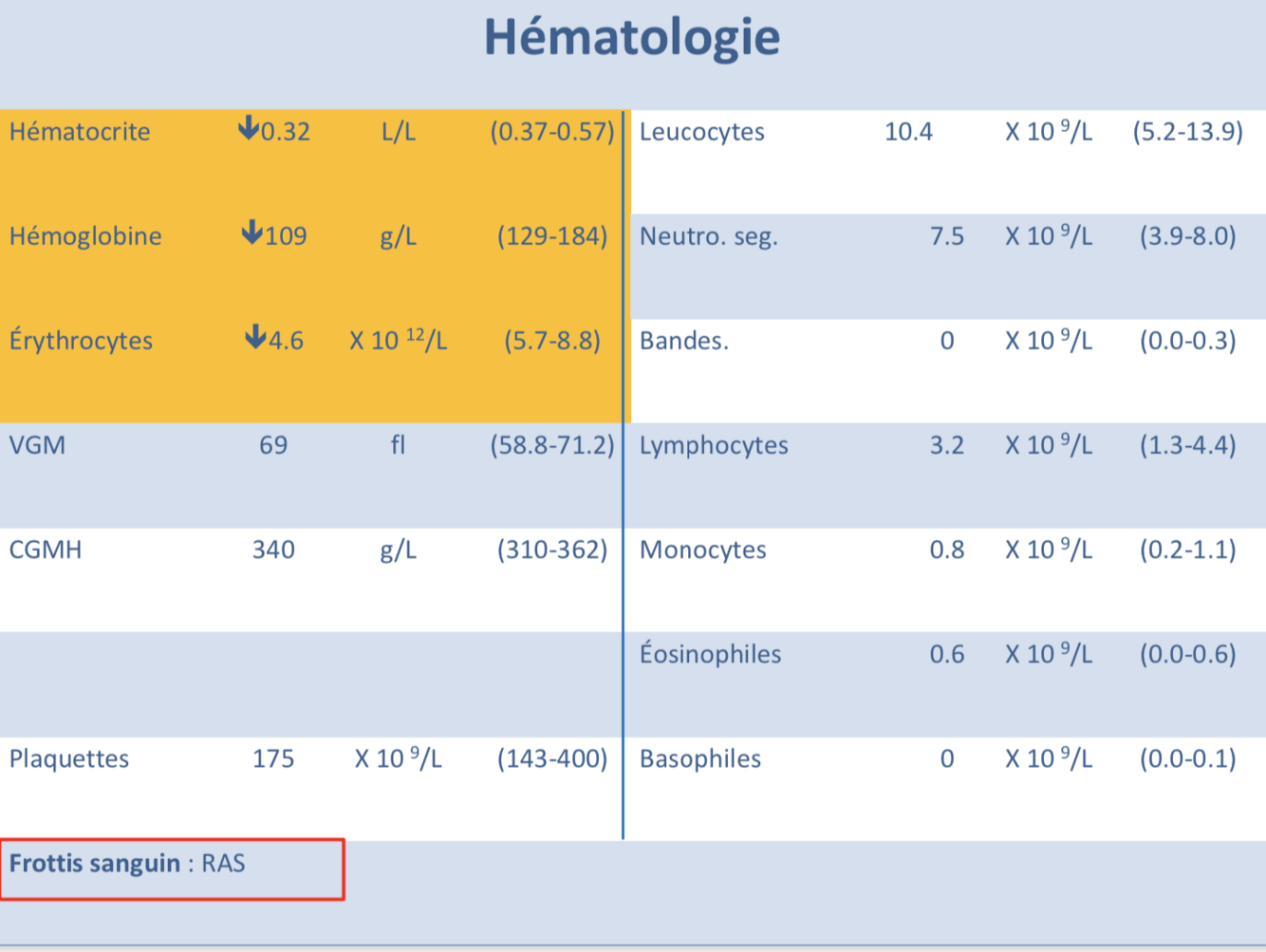 Nommer un élément de l’hématologie qui suggère un addion