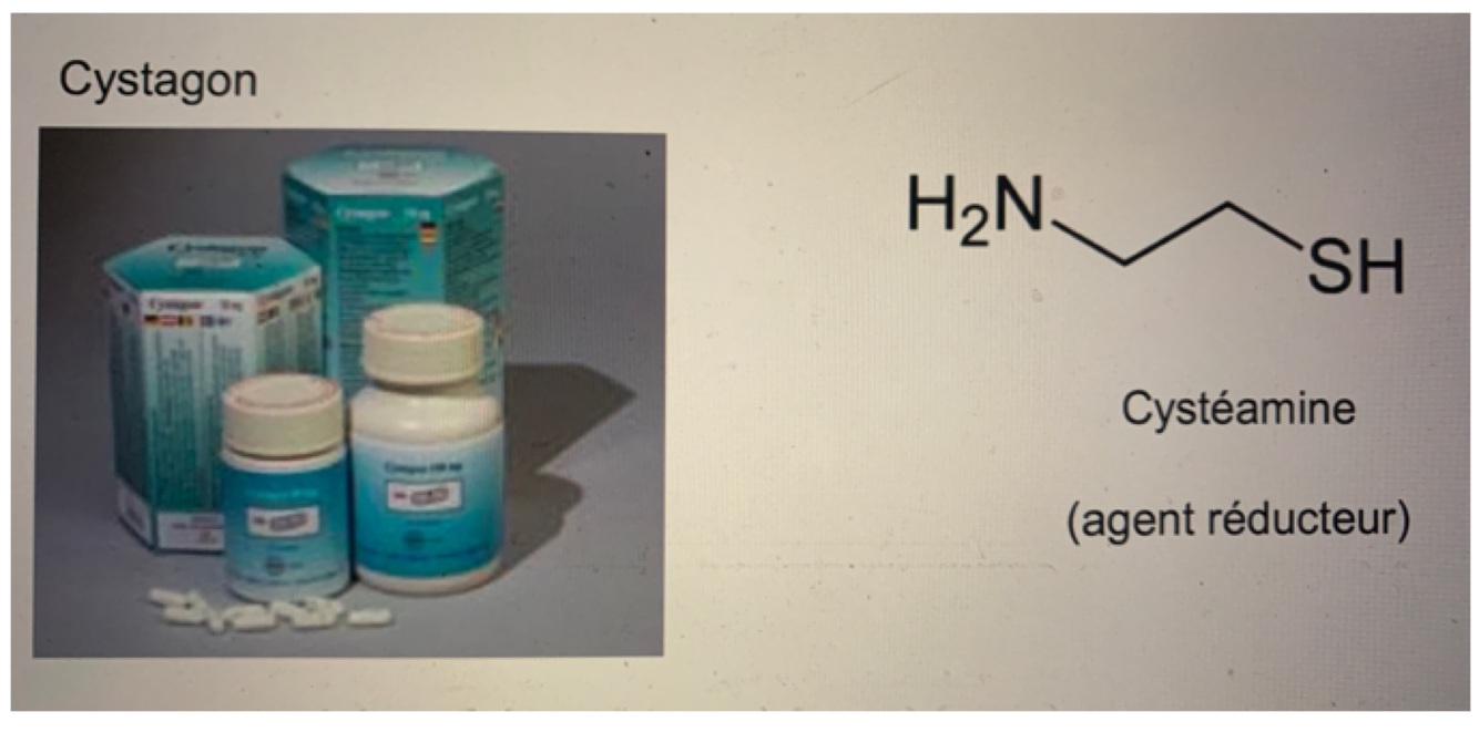 Médicament cystéamine (agent réducteur) —> nom de marque Cystagon