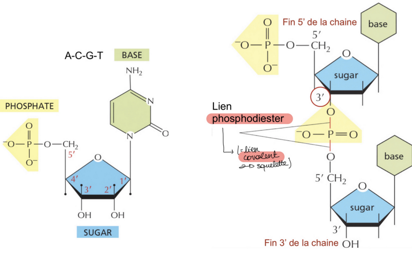 → se lient au phosphate du dessus au niveau de C5’ et au phosphate du dessous au niveau de C3’