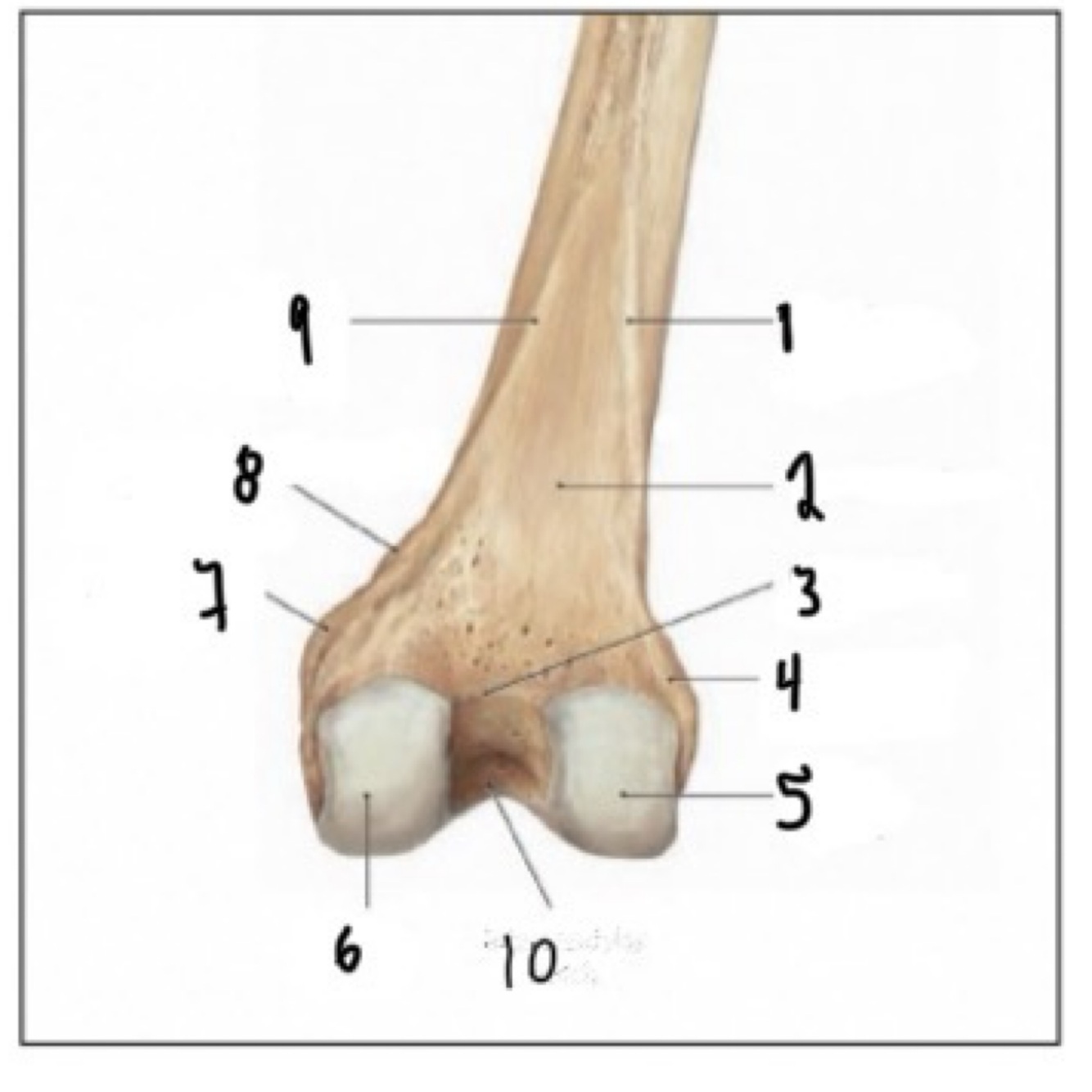 Condyle médial(6)-Condyle latéral(5)-Fosse intercondylaire (10)-épicondyles médial (4) et latéral (7)-tubercule du grand adducteur (8)