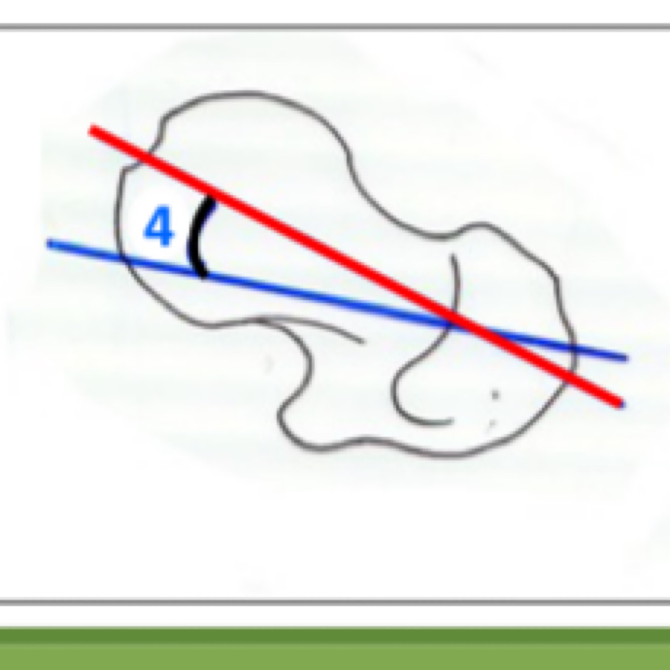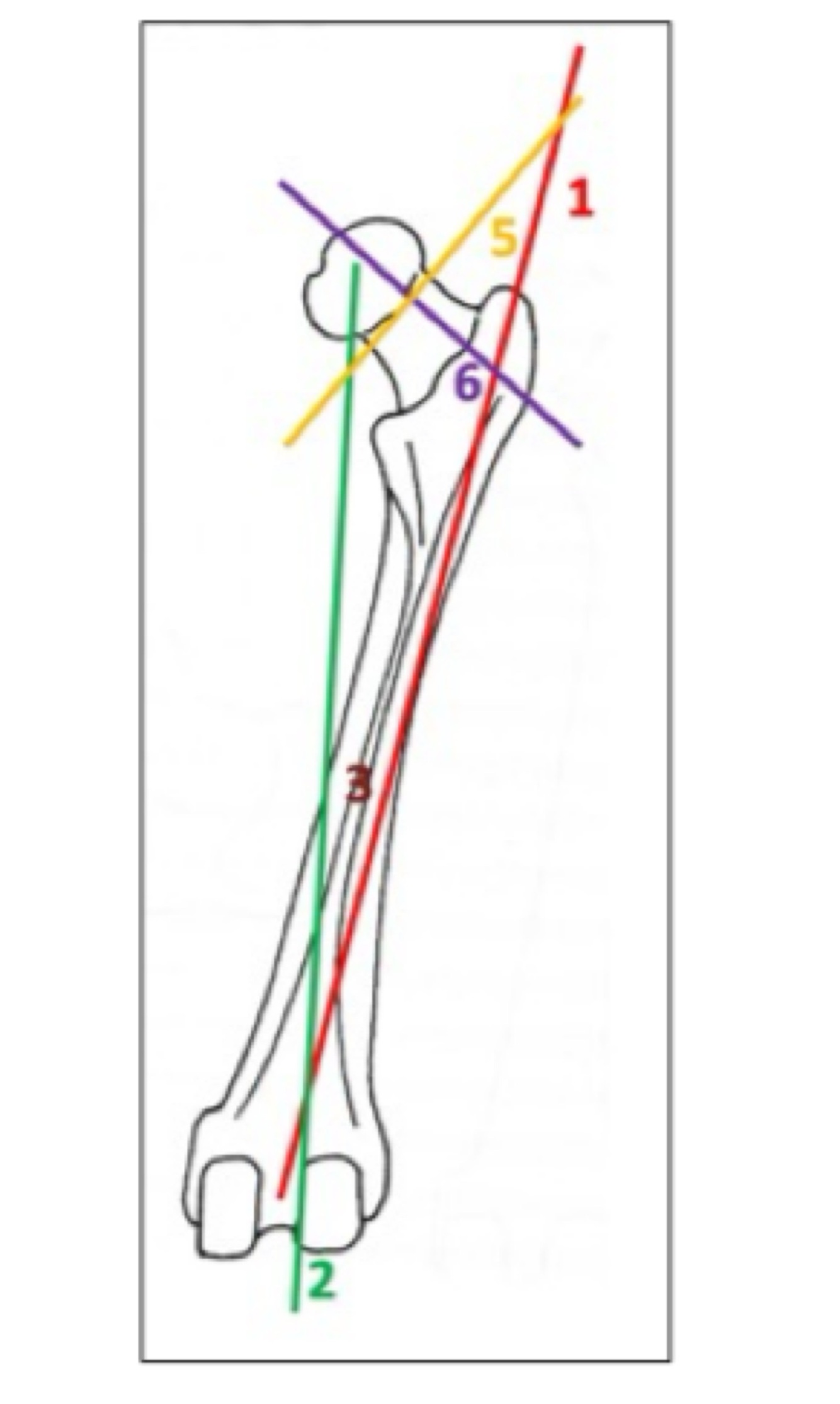 Nomme moi l’axe 1 et l’axe 2 du femur ainsi que l’angle qu’ils forme ensemble