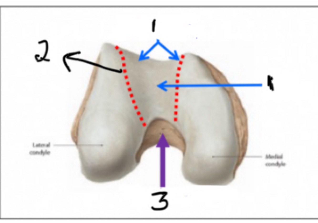 La surface patellaire sur la face ventrale (1)sépare par les lignes condylo-patellaires (2)