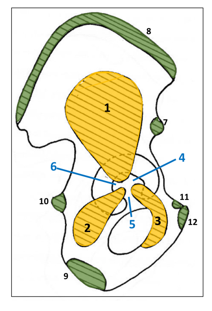 Sur quel partie de l’os coxal les 10 m. du bassin s’insèrent-ils ?