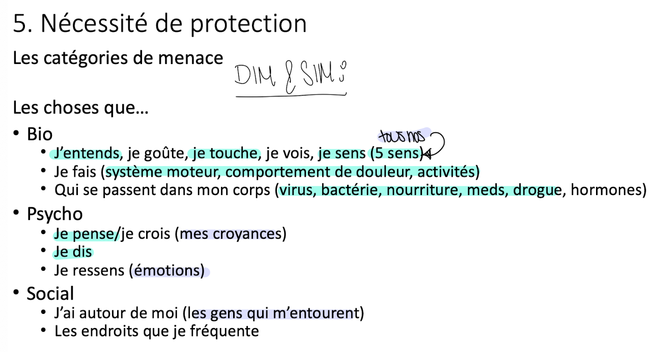 Donne des exemples pour les catégories de menace : bio, psycho, social