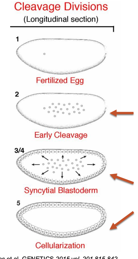 après noyaux migre extérieur pour faire cellularisation (former membrane plasmique, BLASTODERME CELLULAIRE)