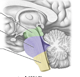 Nommez les différentes parties du tronc cérébral selon les couleurs