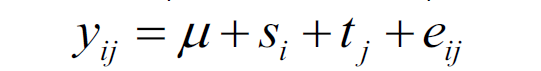 y = valeur de la VD pour le ie sujet au je traitement u = intercept (grande moyenne) s = effet du ie sujet t = effet du je traitement e = erreur de mesure du ie sujet au je traitement