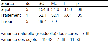 Dans l’ANOVA à mesures répétées, le contrôle de la dépendance temporelle permet de réduire le […] en isolant la variation attribuable aux différences individuelles, et permet ainsi d’augmenter la valeur du […] et ainsi la