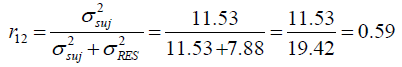 Donc, si on divise la covariance par l’estimé de variance totale, on obtient la corrélation entre les temps.