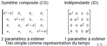 Ce qui est rigide dans l’analyse de mesures répétées et l’assymétrie composée (toutes les covariances doivent être identiques et les variances doivent être identiques). Ça veut dire que la variance au temps 1 est égale au temps 2, etc.