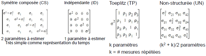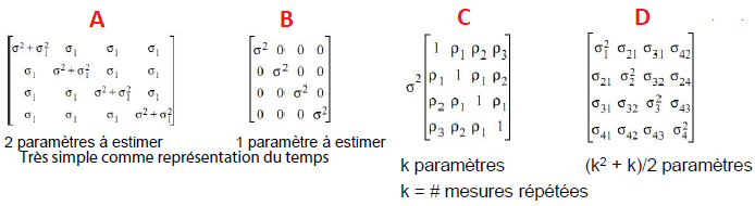 Dans l’ANOVA à mesures répétées, la dépendance temporelle est modélisée à l’aide d’une matrice de variance-covariance […].