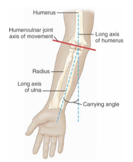 À cause de la gorge trochléenne qui modifie l’axe (bras en extension: partie ulnaire de la main touche pas notre corps alors que bras en flexion: partie ulnaire de la main touche notre corps)