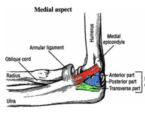 Elle est conjointe entre toutes les articulations (huméro-ulnaire, huméro-radiale et radio-ulnaire prox) donc s’il y a une lésion, tout a tendance à “jammer”