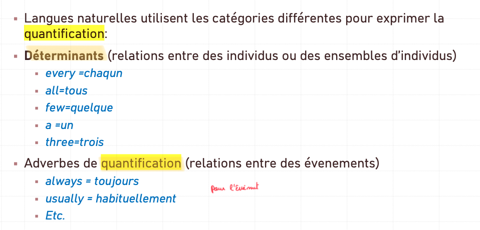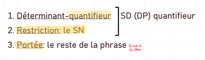 §Le déterminants quantifieurs (chaque, tous, beaucoup, quelques, un, plusieurs) sont des expressions non référentielles.